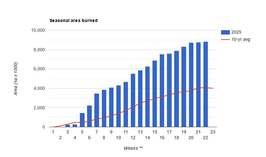 2025 was an active wildfire season across Canada, coming in as the second worst in Canadian history with nearly 8.8 million hectares burned. While meteorologists with DEQ’s Division of Air Quality actively monitor wildfires across North Carolina and factor the resultant smoke into our air quality forecast, we also intently monitor wildfires happening outside of our state and the impacts they may have on the air we breathe.